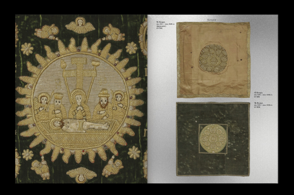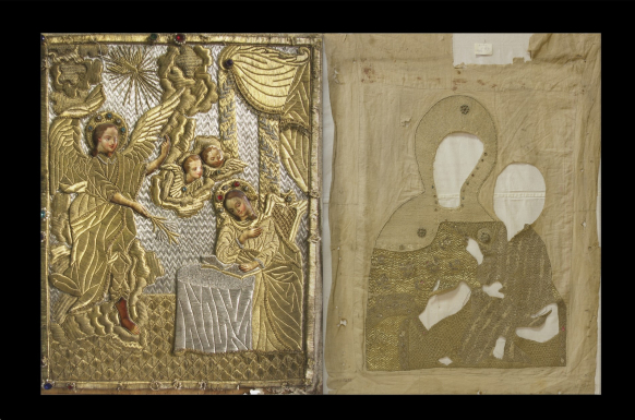 Віра Зайченко: "Гаптування виконували на коштовних тканинах: оксамит, парча, гладкий та узорний шовк. Для підкладки використовували полотно натурального кольору і фарбоване (крашанина), зрідка – вибійчане, бавовну, інколи – шовк. Натурального кольору полотно підкладалося під тонкі тканини і гаптування виконувалося крізь обидві, друга підкладка була кольоровою. Особливістю ранніх творів (XVII – перша половина XVIII століть) було обшивання країв покрівців та воздухів шовковими короткими торочками зеленого, вишневого, коричневого кольорів; на облачення по краях нашивалося металеве мереживо. Основними матеріалами, якими виконувалося гаптування, були золоті і срібні нитки. При цьому таку назву мали не тільки чисто металеві нитки, які використовувалися до XIV століття, а й дешевші визолочені срібні, а також металеві, круто прядені ручним способом на кольоровий шовк, нитки – скані нитки, скань. З XVI століття позолочена срібна нитка прялася на шовк жовтуватого кольору, щоб на випадок менш крутого прядіння шовкові нитки зливалися з кольором металу. Такі нитки називалися золотними. Саме вони та срібні нитки (срібло прядене з білим, блідо-сірим чи блакитним шовком) використовувалися в ранніх гаптованих творах музейної колекції. З середини XVIІІ століття металеві нитки спрядалися з бавовняними. Уже з кінця XVIІІ століття у гаптуванні досить широко, використовувалися такі матеріали як бить (вузька плоска металева стрічка) та канитель (металевий дріт, звитий як спіраль). Додатковими матеріалами слугували срібні позолочені, пізніше – мідні пласкі круглі блискітки, кольорове скло, річкові перли, напівкоштовний камінь, фольга (тонкий лист міді або срібла, визолочений чи вкритий кольоровими фарбами), емаль."